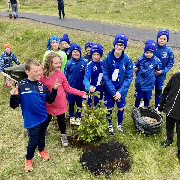 Orkumóts-peyjar í Eyjum gróðursettu í dag 40 grenitré í Vigdísarlund við Helgafellsvöll og við íþr...